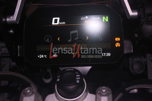 Cluster instrumen memberikan informasi yang cepat dan jeLas untuk pengendara. Menggabungkan tampilan data “klasik” yang familiar seperti rpm dan speedometer, ditambah informasi canggih seperti riding mode, tekanan ban, signal smartphone, battery smartphone, gear, suhu sekitar, penunjuk waktu, suhu mesin, sisa kilometer yang bisa ditempuh dengan sisa bensin yang ada, lama waktu perjalan, jarak perjalan dan masih banyak lagi.