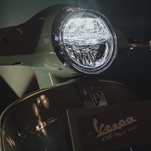 Tampak depan ditandai dengan bentuk bundar dari LED headlamp, sebuah elemen yang menjadi ciri khas dalam sejarah desain Vespa, dilengkapi dengan LED DRL (Daytime Running Light) yang akan mengakomodasi visibilitas yang lebih baik.